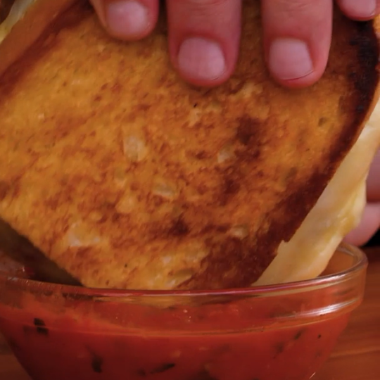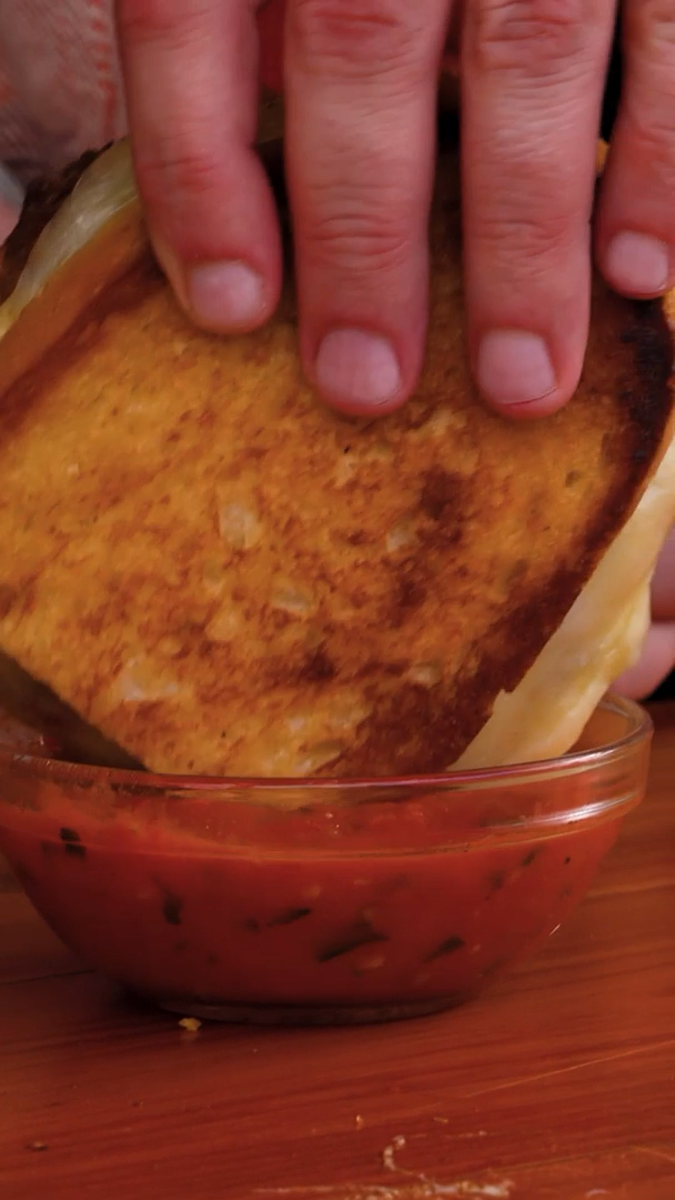The sandwich is done when the cheese is melted throughout and the bread is a crisp golden brown. Remove from the flat top, cut it in half and enjoy dipping in marinara if you wish.