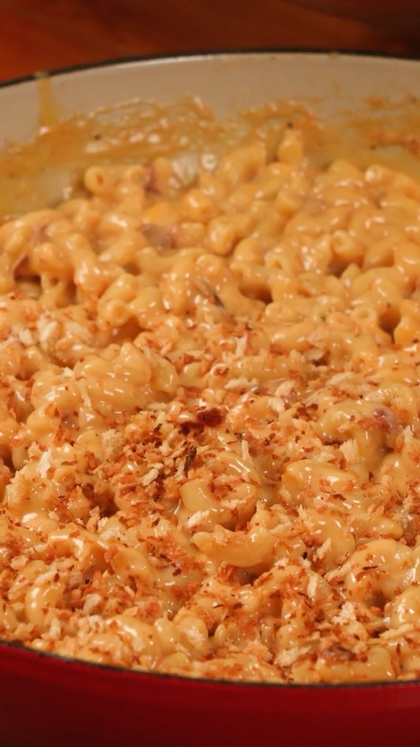 • This is mac & cheese with swagger. Crispy pancetta, toasted breadcrumbs, and a creamy cheese sauce that all happens in one Dutch oven. No side pans, no extra bowls—just maximum flavor with minimal cleanup. And we use the Kenji evaporated milk trick to make the sauce come together and get extra cheesy.