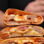 Roll out the pizza dough into a large rectangle. Spread tomato sauce evenly over the surface, leaving a 1-inch border.