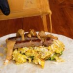 Heat the tortillas on the flat top. To assemble, start with a base layer of sliced avocado seasoned with salt. Top it with scrambled eggs, cheese, sausage, tater tots, chipotle crema, hot sauce and cilantro. Wrap the burrito by folding in the sides and rolling tightly from the bottom up. Lightly toast the burrito on the flat top, seam side down for 1-2 minutes, then flip to crisp the other side. Serve and enjoy!